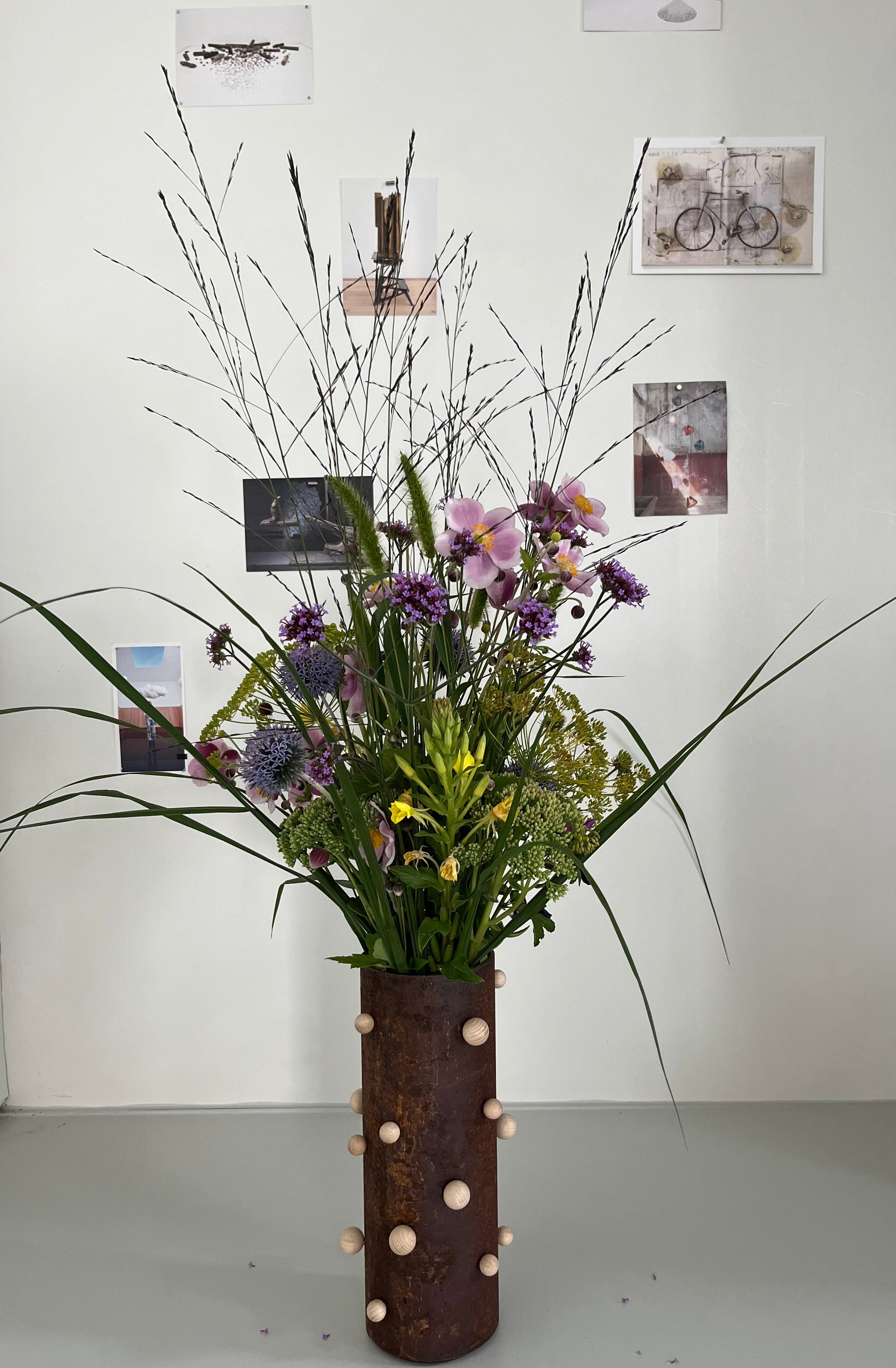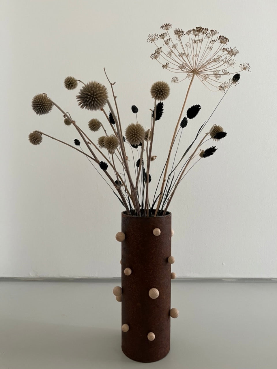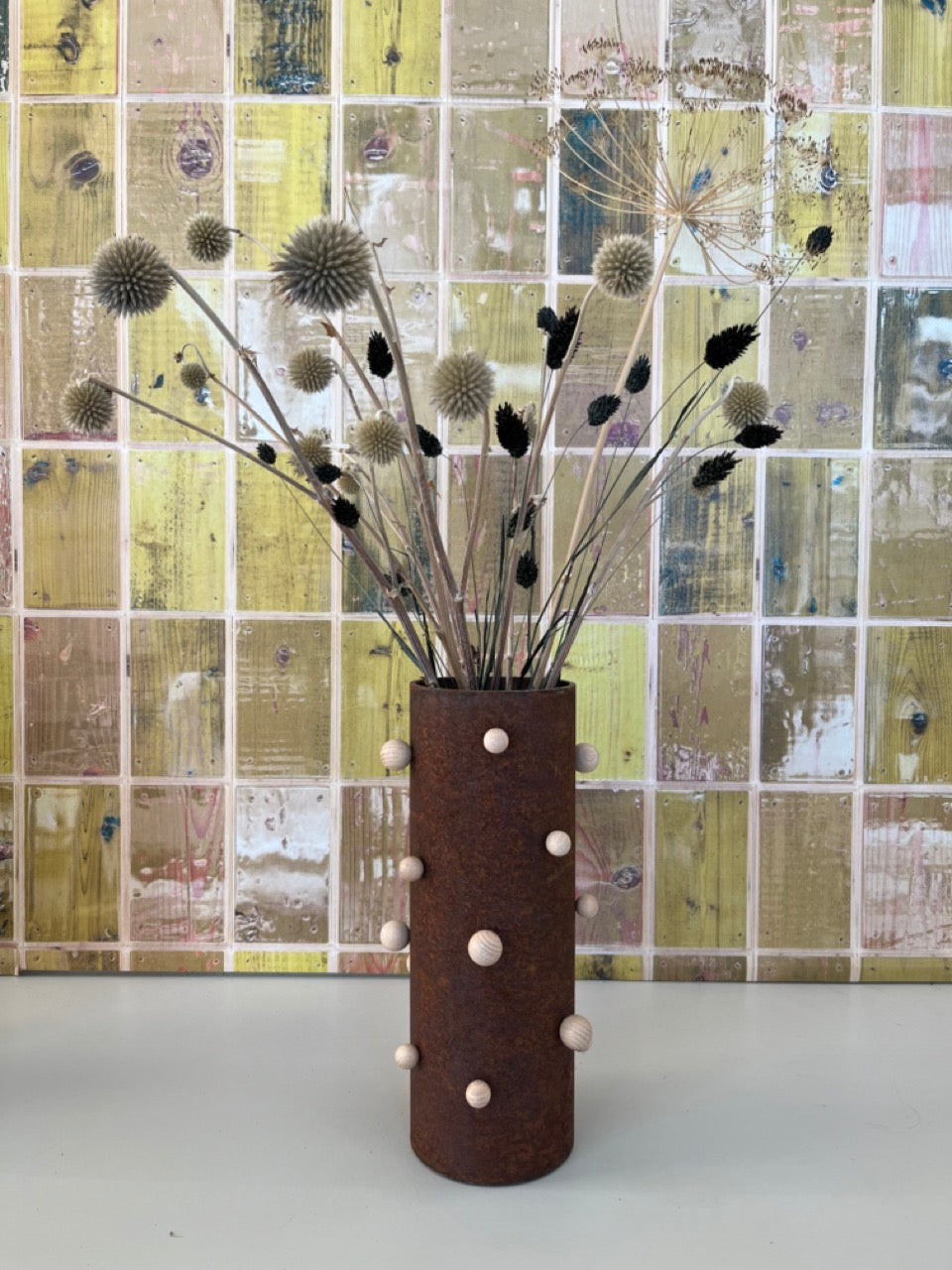 Gemaakt van een stevige stalen pijp en verrijkt met houten bolvormen, combineert dit object industriële kracht met organische zachtheid. Staal staat voor duurzaamheid en stabiliteit, terwijl hout symbool staat voor leven en verbondenheid. Samen vormen ze een perfect evenwicht tussen traditie en moderniteit, waardoor elke bloem of tak een extra laag betekenis krijgt.